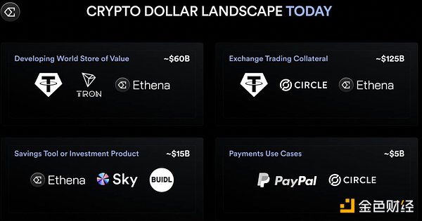 儲(chǔ)蓄工具或投資產(chǎn)品:目前由Ethena和Sky主導(dǎo),幾乎沒(méi)有傳統(tǒng)金融體系對(duì)鏈上產(chǎn)品的參與,市場(chǎng)規(guī)模約為150億美元。