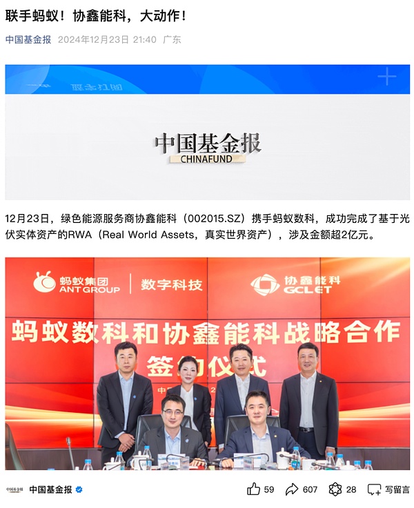 協鑫能科將位于湖北省、湖南省的82MW左右「鑫陽光」戶用光伏作為RWA錨定資產,通過Blockchain技術和IoT(物聯網)技術融合,將戶用光伏項目的自身價值、運營、收益等數據打包存儲在Blockchain上形成數字通證。發行完成當天,螞蟻數科與協鑫能科在蘇州簽署戰略合作協議。雙方將在分布式光伏電站、儲能電站、綜合能源服務等場景,開展新型電力系統建設、綠色金融、人工智能等方面全面合作,繼續為數字產業化和產業數字化探索融合路徑。