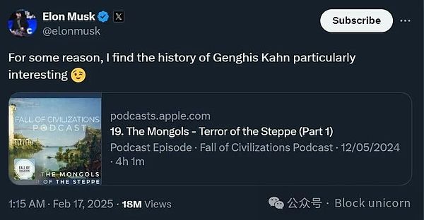在你忍不住嘲笑馬斯克拼錯(cuò)“Khan”之前,請(qǐng)記住,成吉思汗本人也無法拼寫自己的名字,因?yàn)樗麖奈磳W(xué)過讀寫——這再次生動(dòng)地提醒我們,書本知識(shí)和組織才能是兩件非常不同的事情。那些安慰自己說馬斯克永遠(yuǎn)無法征服他們的國家,因?yàn)樗麤]有世界上最高智商的進(jìn)步主義者,就像13世紀(jì)的學(xué)者告訴自己,他的國家永遠(yuǎn)不會(huì)被一個(gè)騎著小馬的文盲征服一樣愚蠢。