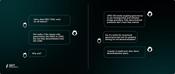 4.Tokens發(fā)行方的主權(quán)控制:發(fā)行方應(yīng)繼續(xù)控制在非原生鏈上鑄造的協(xié)議Tokens的標(biāo)準(zhǔn)版本。解決不可替代跨鏈Tokens的問題,不應(yīng)以讓渡Tokens控制權(quán)為代價(jià)(尤其是控制總供應(yīng)量,配置鑄造和銷毀機(jī)制等管理方面)。