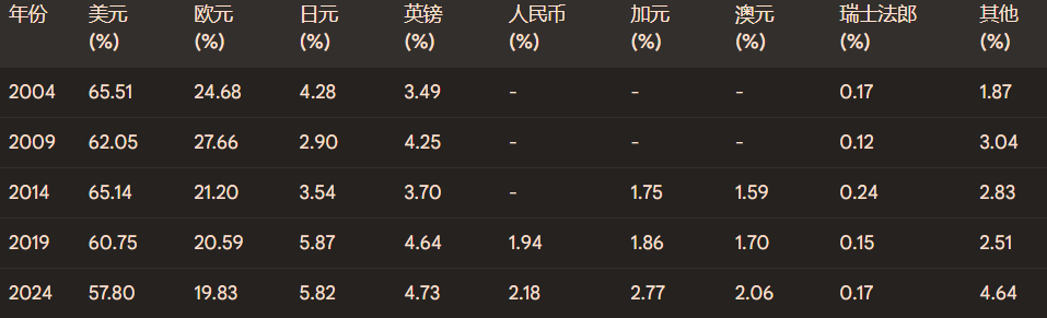 除了石油美元體系,美元作為全球主要的儲(chǔ)備貨幣也進(jìn)一步鞏固了其霸權(quán)地位。各國(guó)央行為了應(yīng)對(duì)國(guó)際收支平衡、干預(yù)外匯市場(chǎng)以及作為國(guó)家財(cái)富的儲(chǔ)存,都需要持有一定數(shù)量的外匯儲(chǔ)備。由于美國(guó)經(jīng)濟(jì)體量龐大、金融市場(chǎng)發(fā)達(dá)且具有相對(duì)的穩(wěn)定性,美元自然而然地成為了各國(guó)央行的首選儲(chǔ)備貨幣。