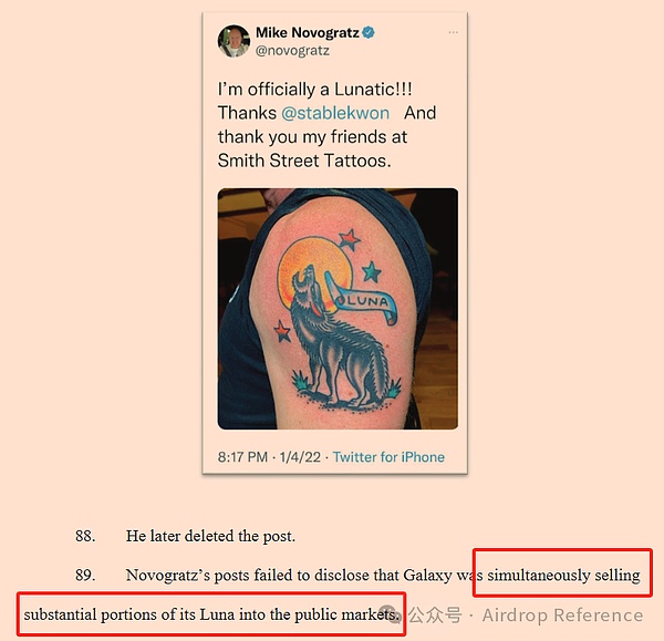 先講一個細節,文件中詳細講述了MikeNovogratz,也就是Galaxy的CEO,如何用紋身來拉高Luna的。