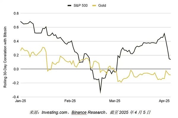 劇烈的市場反應也凸顯出加密資產在劇烈「風險規避」時期的表現特征:Bitcoin(BTC)下跌了19.1%,大多數主流山寨幣跌幅與其相當甚至更大。Ethereum(ETH)跌幅超過40%,高貝塔板塊(如Meme幣與人工智能相關Tokens)則暴跌超過50%。本輪拋售抹去了年初以來加密市場的多數漲幅,截至4月初,即便是BTC的年初至今(YTD)收益也已轉為負值——盡管其在2024年表現強勁。