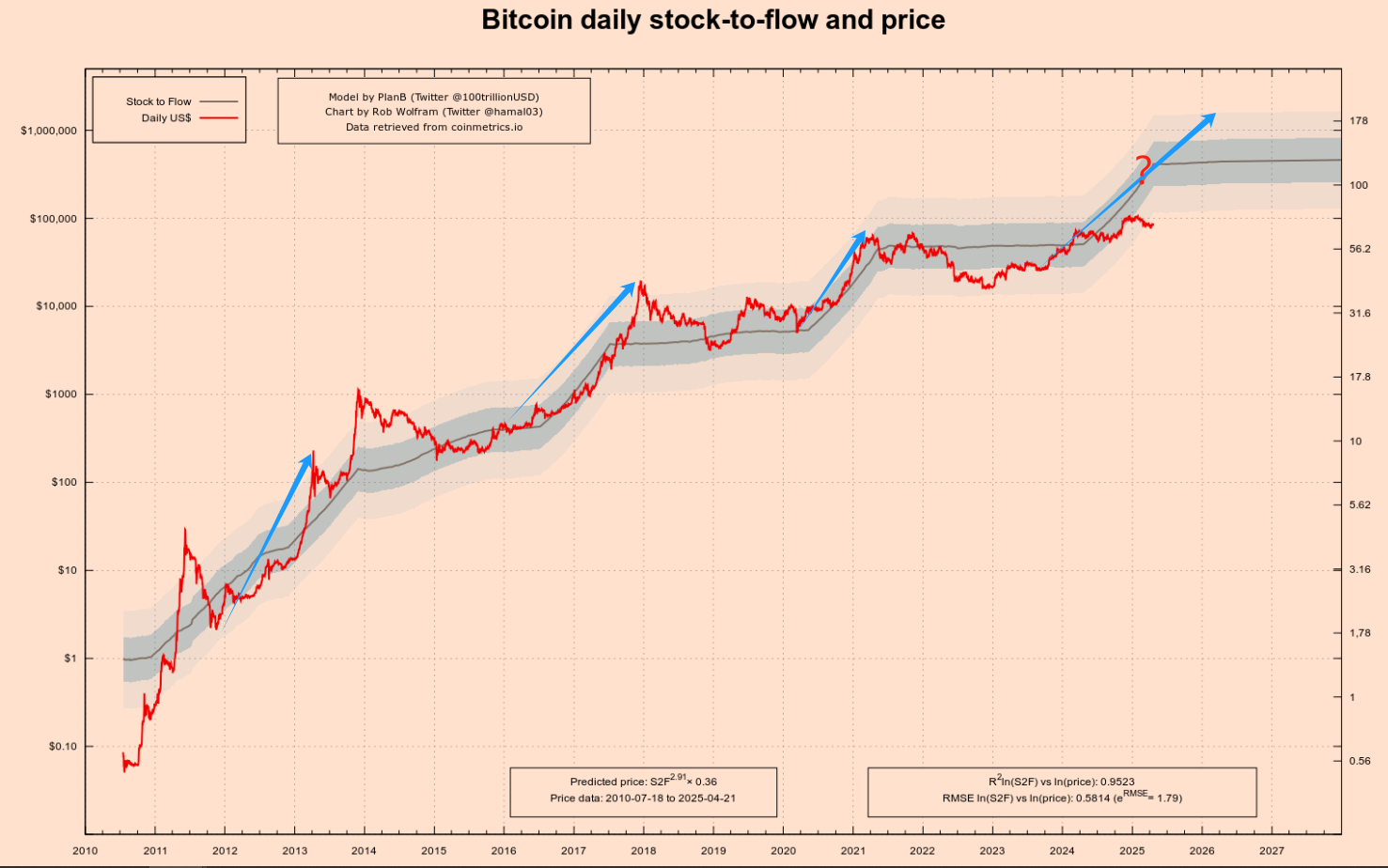 這張圖試圖告訴每一個人,每當Bitcoin進入新的減半周期,流通中的新增產出被“腰斬”,S2F比例隨之上升,而模型預測的長期價格也同步抬升。這個模型已經準確預測了前三次了,但是第四次是否準確還是未知數。