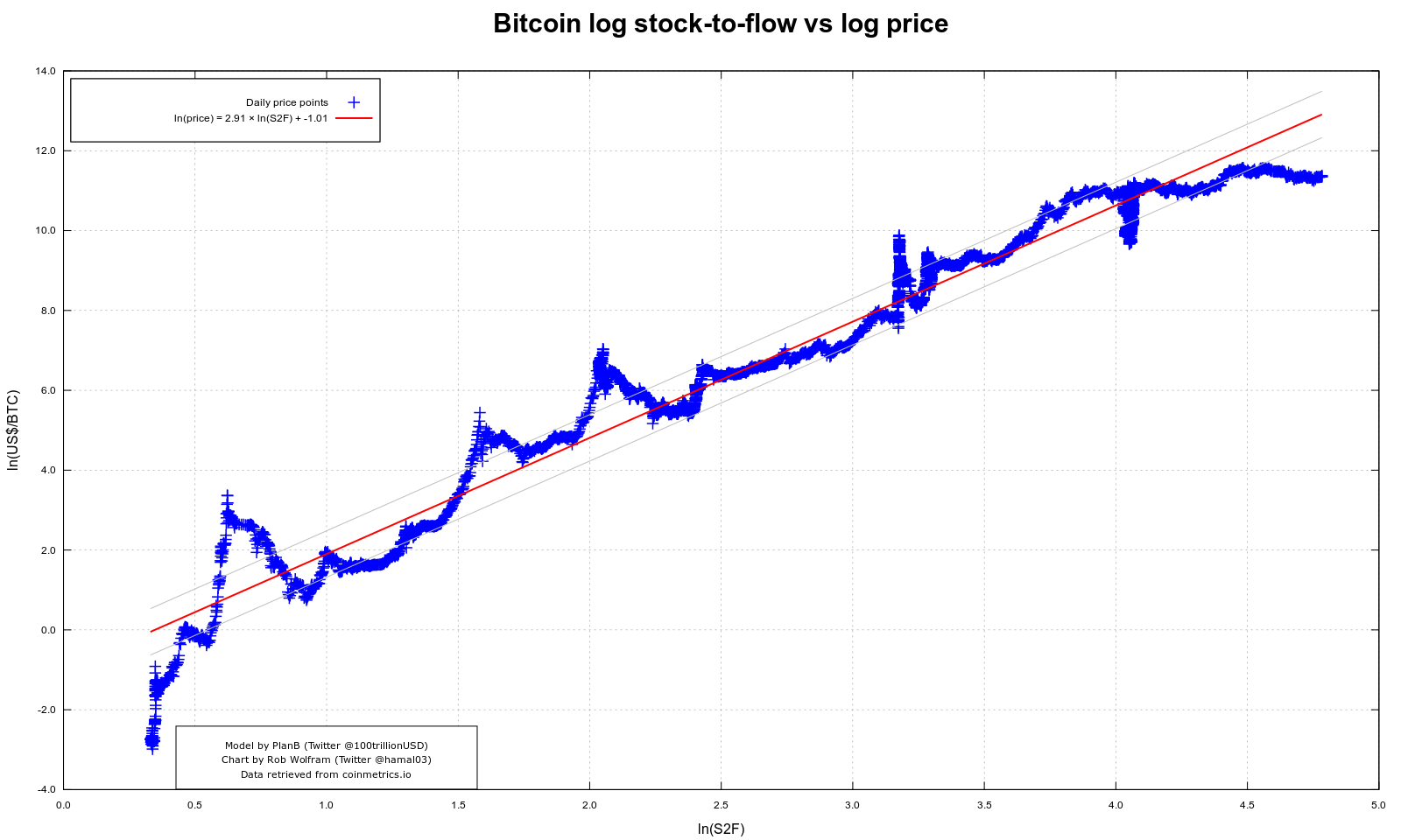 在幣圈最流行的一張圖之一,叫做BitcoinS2F模型擬合圖,如下圖所示。它不僅以視覺上的簡潔直觀著稱,更因為背后的邏輯一度成為“Bitcoin長期價格上漲”的最有力證明之一。