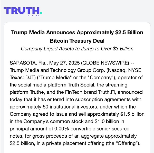 特朗普媒體集團(tuán)在5月27日剛剛宣布要募資25億美元買Bitcoin作為長(zhǎng)期儲(chǔ)備,其中15億美元是增發(fā)股票,10億美元是債,出資的是50家機(jī)構(gòu)。