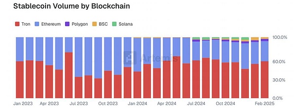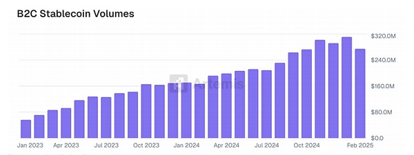 截至發布日期,Artemis 估計每年有 26 萬億美元的鏈上穩定幣結算(經過調整以去除已知的噪聲源),但其中很大一部分是與交易(在交易所和 DeFi 上)、驗證可提取價值(MEV)和其他非支付類型交易相關的交易。在我們的研究中,我們能夠對所有穩定幣結算活動的約 1%進行匯總。雖然這個數字看起來很小,但根據我們最近一個月的數據(2025 年 2 月),它相當于基于穩定幣的已知支付金額的 723 億美元。