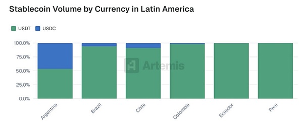 在所有被分析的地區中,USDT 以較大優勢成為主導的穩定幣,而 USDC 則遠遠地排在第二位,但其地位已經明確確立。這兩種穩定幣占據了絕大部分的觀察到的交易量,遠遠超過了所有其他替代品。