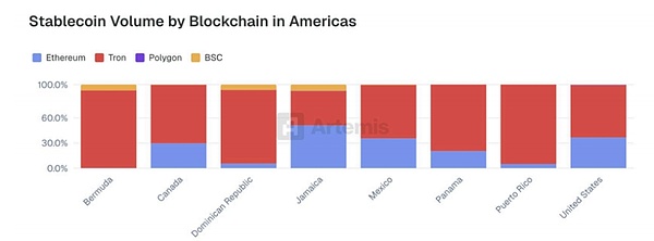 在整個拉丁美洲,Tron 作為穩定幣結算的主要Blockchain占據主導地位,尤其是在哥倫比亞、厄瓜多爾和巴西,它占據了這些地區大部分的觀察到的活動。相比之下,在阿根廷和秘魯, Ethereum 仍然是領先的Blockchain,在這些市場中超越了 Tron 。Polygon 在阿根廷和秘魯有適度的使用情況,而 BSC 在智利、巴西和厄瓜多爾獲得了顯著的吸引力。