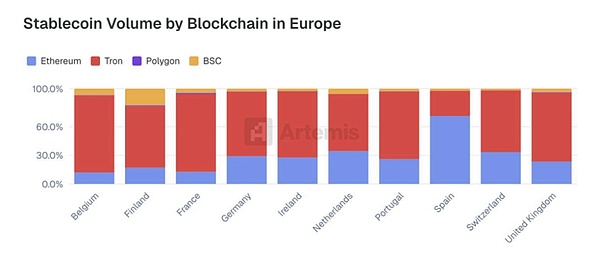 在所有被分析的歐洲國家中,USDT 在穩定幣的使用上占據壓倒性優勢,始終占據超過 90%的轉賬量。USDC 的活動僅限于有限范圍,其在每個市場的份額都保持在 10%以下。其他穩定幣,包括 PYUSD 和 DAI,在數據集中幾乎不存在。