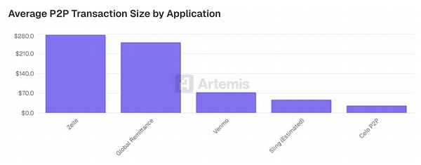 穩定幣轉賬的低成本特性解鎖了更廣泛的應用場景,特別是對于小額交易。像 Sling 和 CeloP2P 這樣的平臺記錄的平均交易規模顯著低于傳統的替代品,如 Zelle(277 美元)和全球匯款服務(250 美元),這些傳統服務通常會收取更高的費用。這種成本效率使得穩定幣不僅可以用于高價值的匯款,還可以用于輕量級、頻繁的點對點支付。