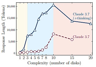 然而,對于更復雜的問題,這一趨勢會發生變化——解決方案的準確性會隨著思考的推進而提高,直至達到某個閾值。超過這個復雜度閾值,在“崩潰模式”下,模型的準確率為零。