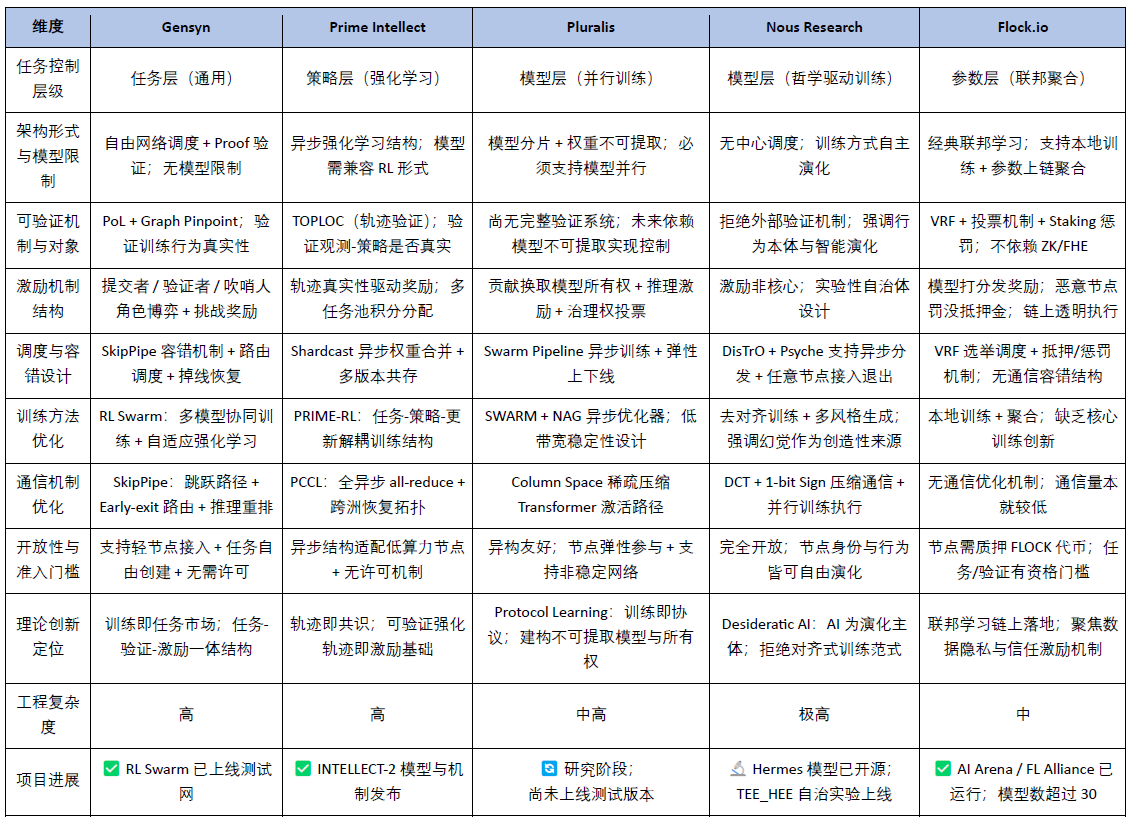 以下表格基于上述指標體系,對Gensyn、PrimeIntellect、Pluralis和NousResearch在去中心化訓練路徑上的技術深度、工程成熟度與理論創新進行了系統性評估。