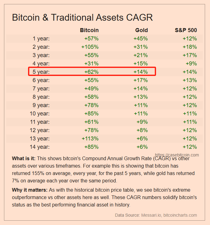 數(shù)據(jù)顯示,過去5年Bitcoin年復(fù)合增長率高達(dá)62%,遠(yuǎn)超黃金約14%的增長。這是一個(gè)“用數(shù)字說明勝出的資產(chǎn)結(jié)構(gòu)”。