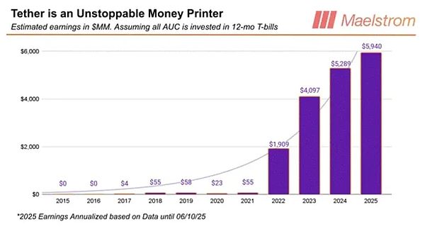 Tether每年的盈利遠超此圖估算。此圖假設(shè)所有穩(wěn)定幣都投資于12個月期國庫券,其目的是表明Tether的盈利與美國利率高度相關(guān)。您可以看到,由于美聯(lián)儲以1980年代初以來最快的速度加息,Tether的盈利在2021年至2022年間大幅躍升。