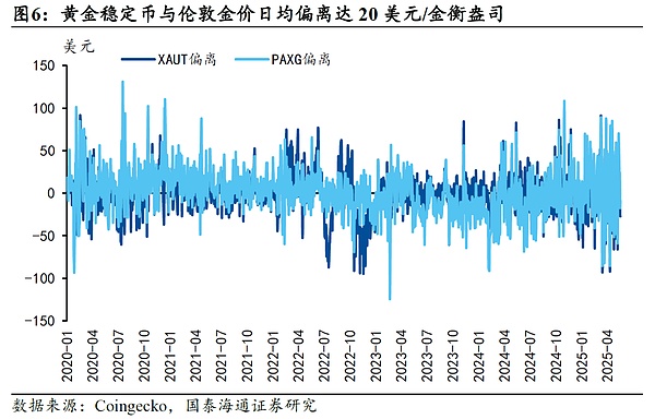 二是黃金穩定幣本應發揮出來的價值穩定功能較弱。相較Bitcoin和美元穩定幣(如USDT),黃金穩定幣的持有者數量極少,XAUT和PAXG的持有人數量總和不到5萬個錢包地址,表明黃金穩定幣的持有集中度較高,這導致了黃金穩定幣較低的交易換手率、較淺的市場深度、以及與倫敦金價較高的偏離度。在黃金穩定幣的“穩定”屬性被削弱的情況下,投資者或更愿意持有黃金ETF或者期貨等其他替代品。