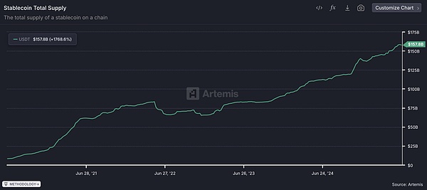 其中,USDT仍為規模最大的穩定幣,供應量在2024年已突破1180億美元,占當時穩定幣市值近75%;截至2025年中,USDT流通量進一步增至約1500億美元,約占全球穩定幣總量的63%。