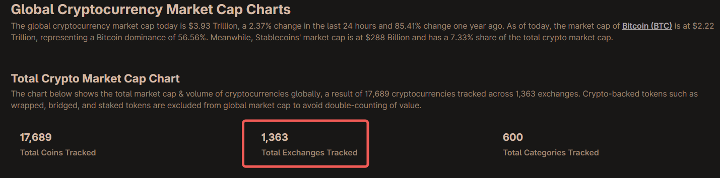 放眼當下,全球被統計在冊的加密交易場所動輒上千:僅CoinGecko的“全球圖表”就顯示追蹤1,300+交易所(如下圖);而CoinMarketCap的現貨榜單也長期顯示兩百余家在活躍報量——這還不含各類衍生品與鏈上DEX的長尾場所。這樣的版圖,意味著沒有誰能天然看到“全市場最優價”。