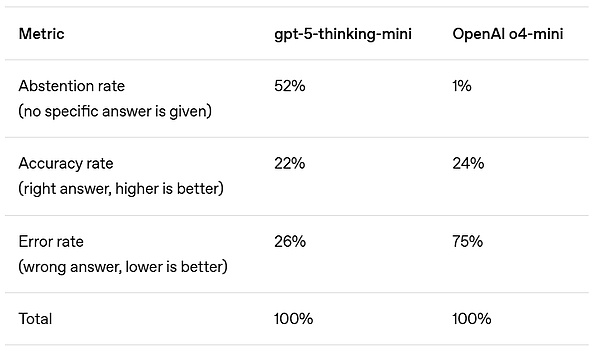 在準(zhǔn)確度方面,更早期的OpenAIo4-mini模型表現(xiàn)略好。然而,其錯(cuò)誤率(即幻覺率)明顯較高。在不確定的情況下進(jìn)行策略性猜測可以提高準(zhǔn)確度,但也會增加錯(cuò)誤和幻覺。