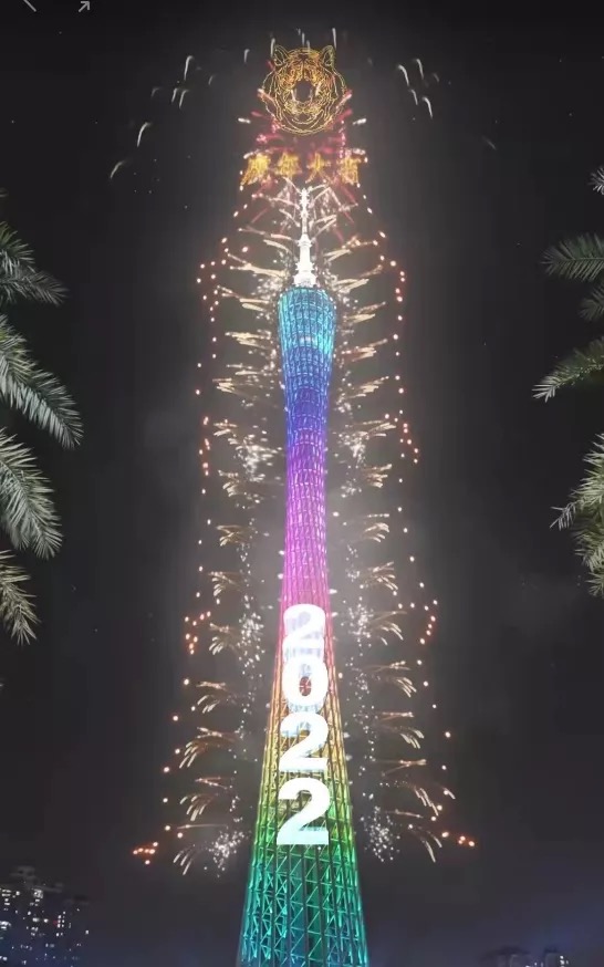 除夕夜,廣州塔打造了虎年新春AR燈光秀,首次實現了與澳門塔隔空“云”上聯動,以流動的光影和全新的視覺體驗展示了雙塔的夢幻變身,最后煙花綻放出現了恭賀新春的字樣,科技感十足。