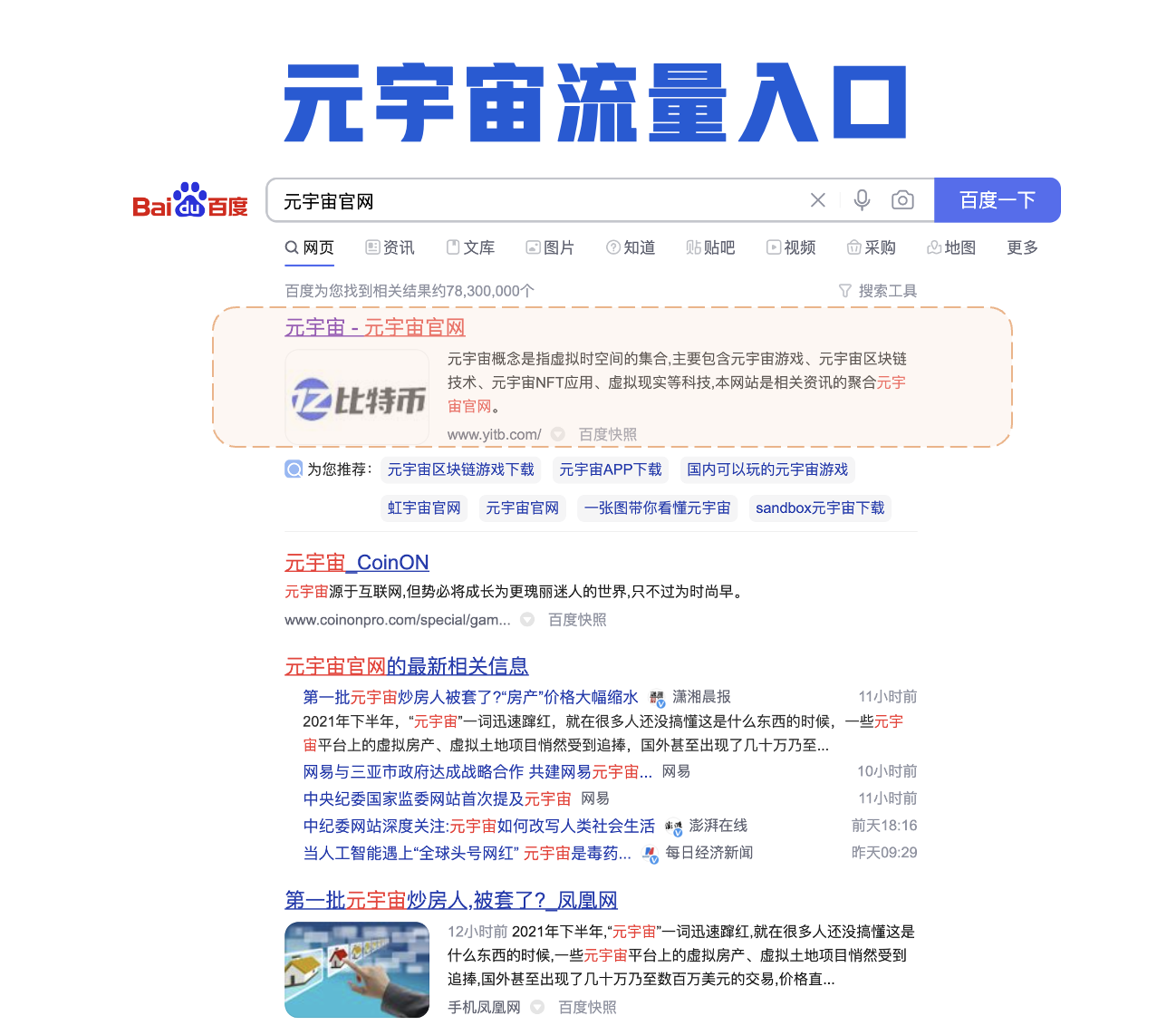 百度搜索“元宇宙”、“元宇宙官網(wǎng)”均在首頁顯著位置