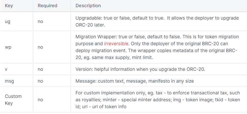 Tokens遷移(wp):默認為 false,表示是否允許將 BRC-20 Tokens遷移到 ORC-20 協議。只有 BRC-20 協議的原始部署者才能部署遷移事件。
