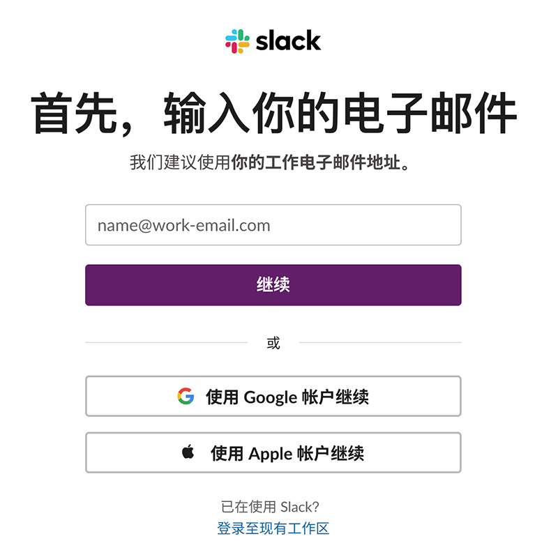 可以使用郵箱「前往這里注冊 Slack 賬號」(可以使用企業(yè)郵箱 或 Gmail、Outlook 等,注意QQ 郵箱不支持),或者直接使用 Google、Apple 賬號進(jìn)行授權(quán)登錄。郵箱進(jìn)行注冊,郵箱驗(yàn)證之后就能成功注冊。