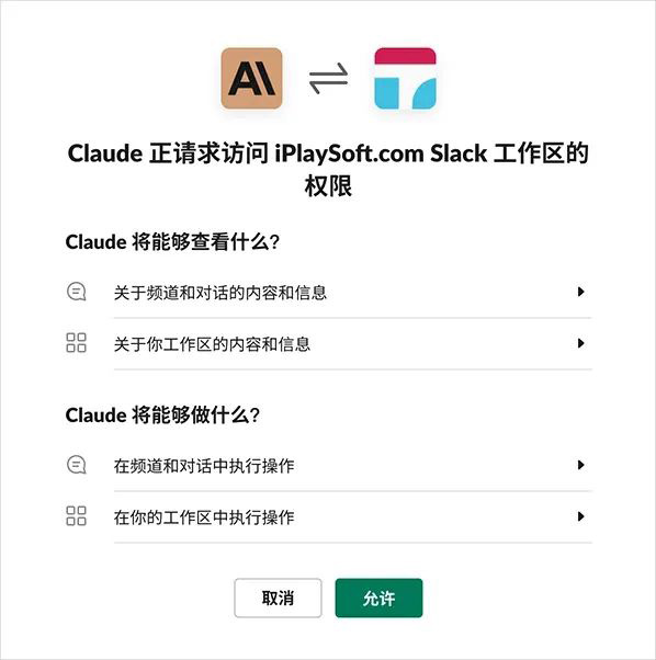 Slack 賬號和工作區(qū)都準(zhǔn)備好了就可以“一鍵安裝 Claude”了。但現(xiàn)在你需要先準(zhǔn)備一個(gè)美國 IP 的網(wǎng)絡(luò)環(huán)境,然后「點(diǎn)擊 Add to Slack 這個(gè)鏈接」即可在 Slack 里添加 Claude 機(jī)器人應(yīng)用。看到對話框,點(diǎn)擊“允許”給予權(quán)限即可,至此我們就已經(jīng)全部搞定了,非常的簡單!