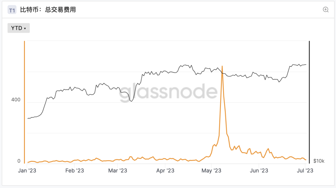 而在今年五月中旬,BRC-20協議的爆火,使得Bitcoin網絡擁堵,手續費飆升,巔峰時,交易量較平時增加一倍,區塊生產者一周賺取超3600萬美元手續費,占區塊生產總收入的15.9%。