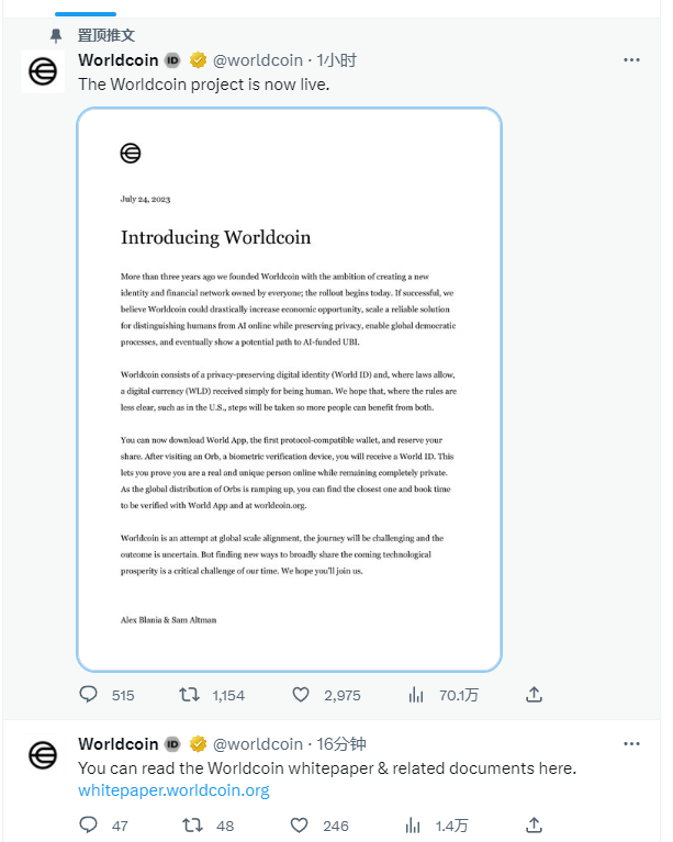 2023年7月24日,OpenAI首席執行官、Worldcoin聯合創始人Sam Altman在推特宣布,Worldcoin項目正式上線。Worldcoin項目包括隱私保護的數字身份WorldID和數字TokensWLD。