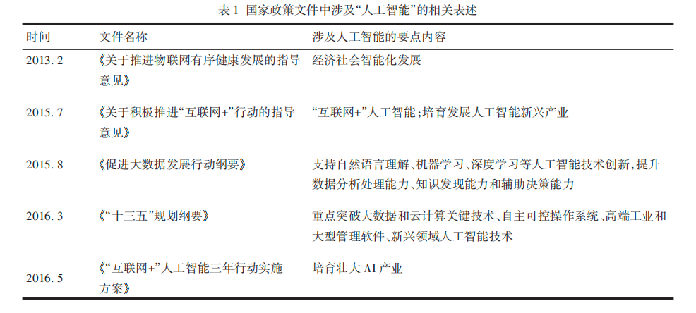 自2013年2月發(fā)布的《關(guān)于推進(jìn)物聯(lián)網(wǎng)有序健康發(fā)展的指導(dǎo)意見》提出“經(jīng)濟(jì)社會(huì)智能化發(fā)展”以來(lái),AI便進(jìn)入國(guó)家宏觀戰(zhàn)略的視野,成為國(guó)家頂層政策文件的重要議題。例如,2015年《關(guān)于積極推進(jìn)“互聯(lián)網(wǎng)+”行動(dòng)的指導(dǎo)意見》首次提出“培育發(fā)展人工智能新興產(chǎn)業(yè)”。此后,國(guó)家對(duì)AI的重視程度不斷提高,持續(xù)在戰(zhàn)略層面對(duì)發(fā)展AI做出部署,確保實(shí)現(xiàn)核心技術(shù)自主可控,推進(jìn)高水平科技自立自強(qiáng)(表1)。