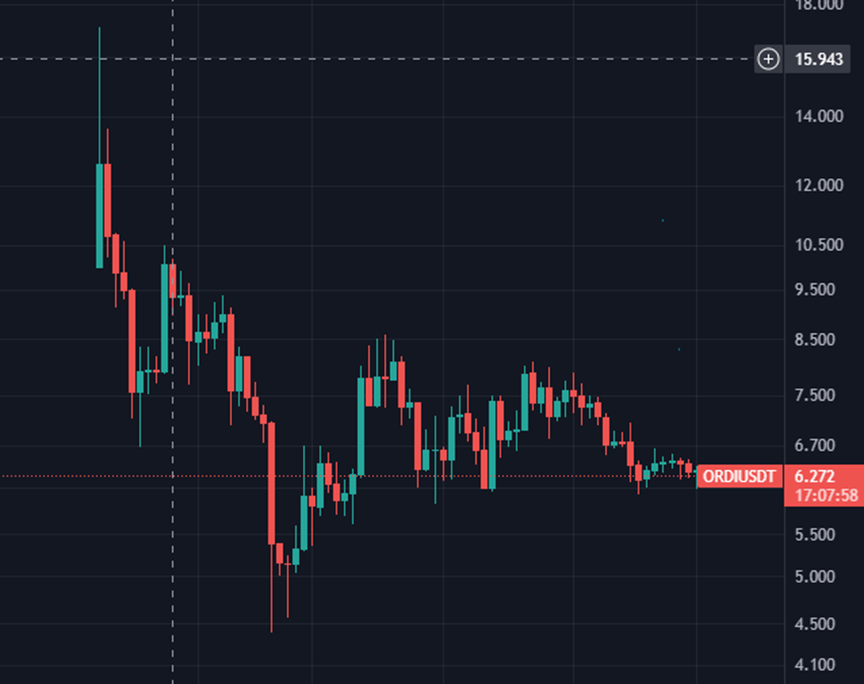 所以根據Ordinals給的思路,第一個基于BTC的Tokens協議:BRC-20橫空出世,協議的制定者domo就用BRC-20協議發行了第一款BTC鏈上的Token-$ordi,也就是ordinals前四個字母,初期鑄造成本約0.1U一聰,最高 17 U,現在跌到了 7 U,依舊是穩穩70倍漲幅啊。