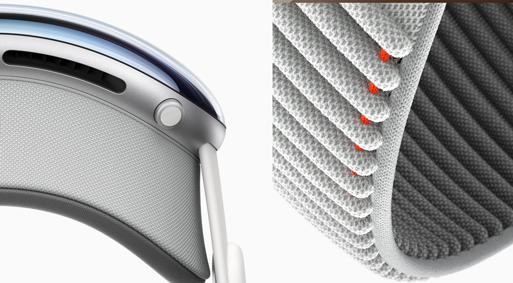 Apple Vision Pro 在精巧的設(shè)計(jì)中搭載驚人數(shù)量的尖端科技。單片 3D 成型與層壓的玻璃打磨形成光學(xué)表面,作為一系列相機(jī)和感測(cè)器的鏡片,以將數(shù)位內(nèi)容與真實(shí)世界結(jié)合。訂制的鋁合金邊框在使用者的臉周?chē)⑽澢c玻璃完美融合,模組化的設(shè)計(jì)能個(gè)別調(diào)整以符合各式各樣的人。遮光眼罩使用柔軟的織物,提供各種尺寸和形狀以服貼每一位使用者的臉型。鬆緊帶確保音訊保持靠近使用者的耳朵,多尺寸的頭帶採(cǎi)用 3D 織法不僅舒適、透氣并具有彈性1。頭帶透過(guò)單一機(jī)制固定,容易更換尺寸及造型。