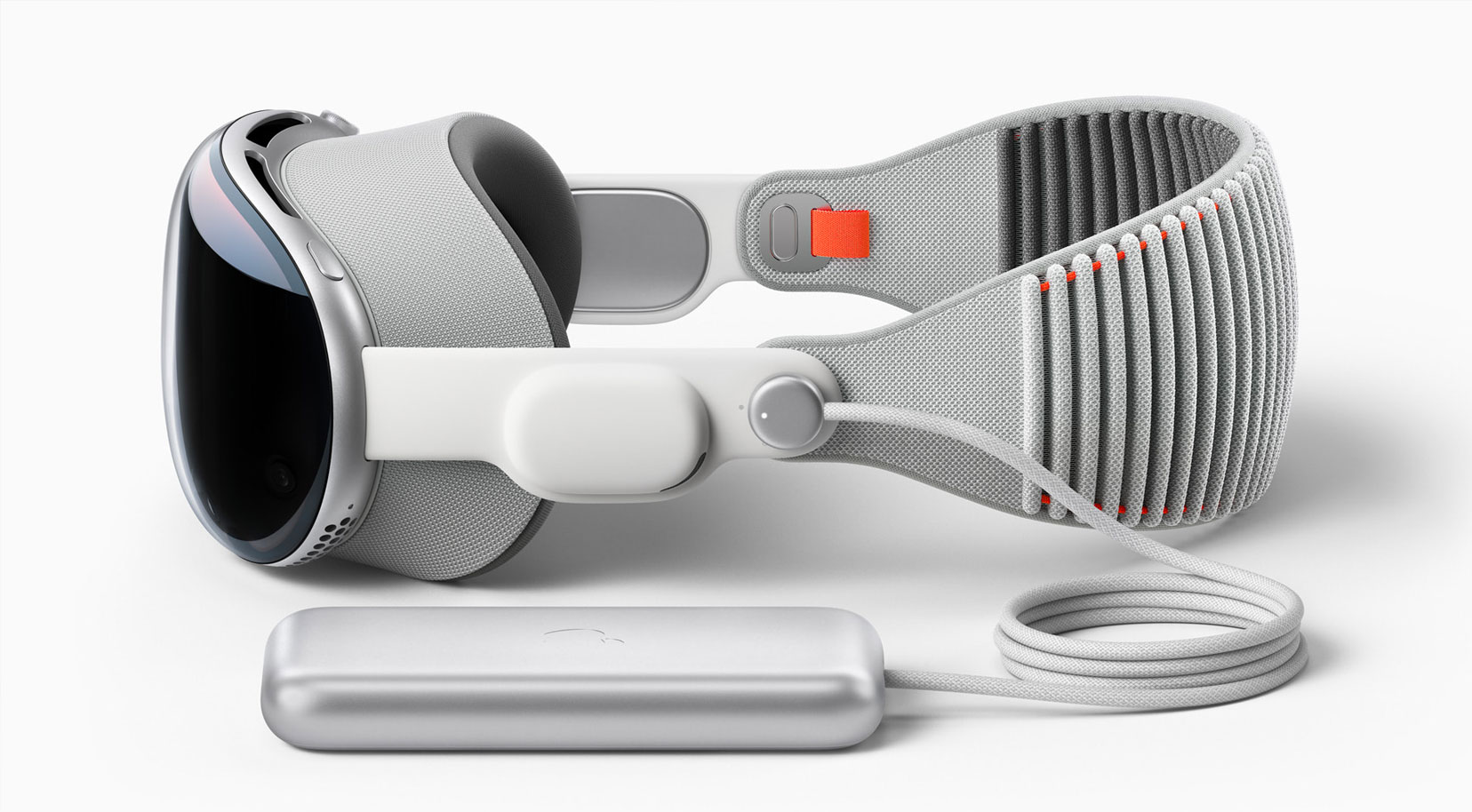 為了提高舒適性,Apple Vision Pro采用模塊化設(shè)計(jì),頭帶采用編制材質(zhì),減輕了頭顯的整體重量。電池外置,提供了2小時(shí)的續(xù)航能力。