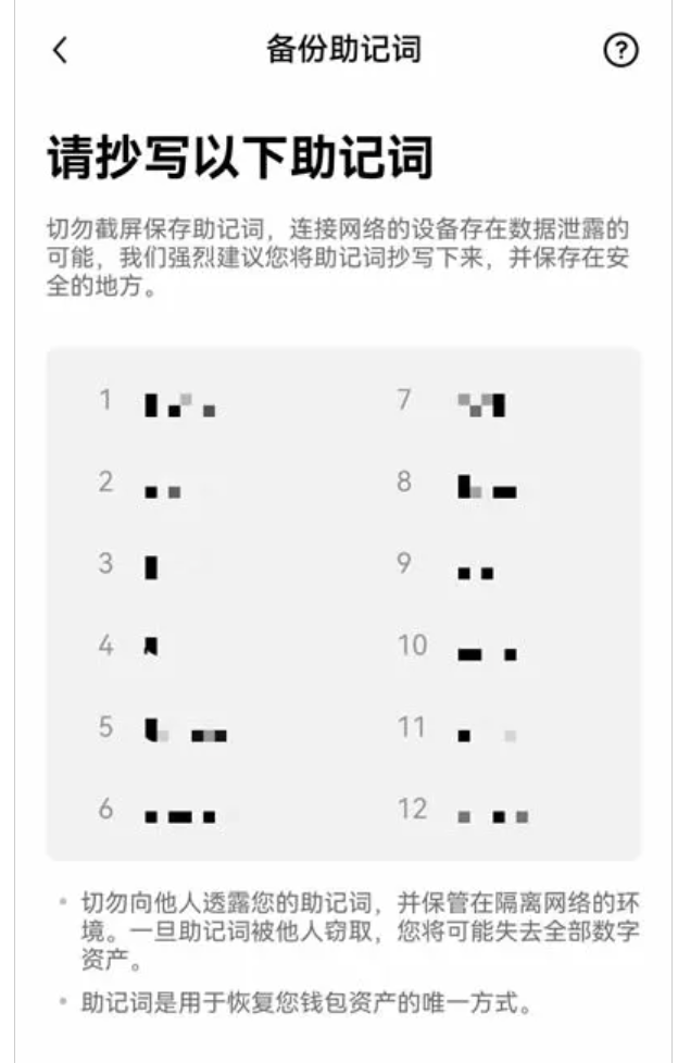 2)備份錢包提示出現,點擊【開始備份】,輸入剛剛創建的錢包密碼,便會出現助記詞界面。請妥善保管好助記詞,建議抄至紙質筆記本上存放起來。完成備份后,錢包便創建成功了。