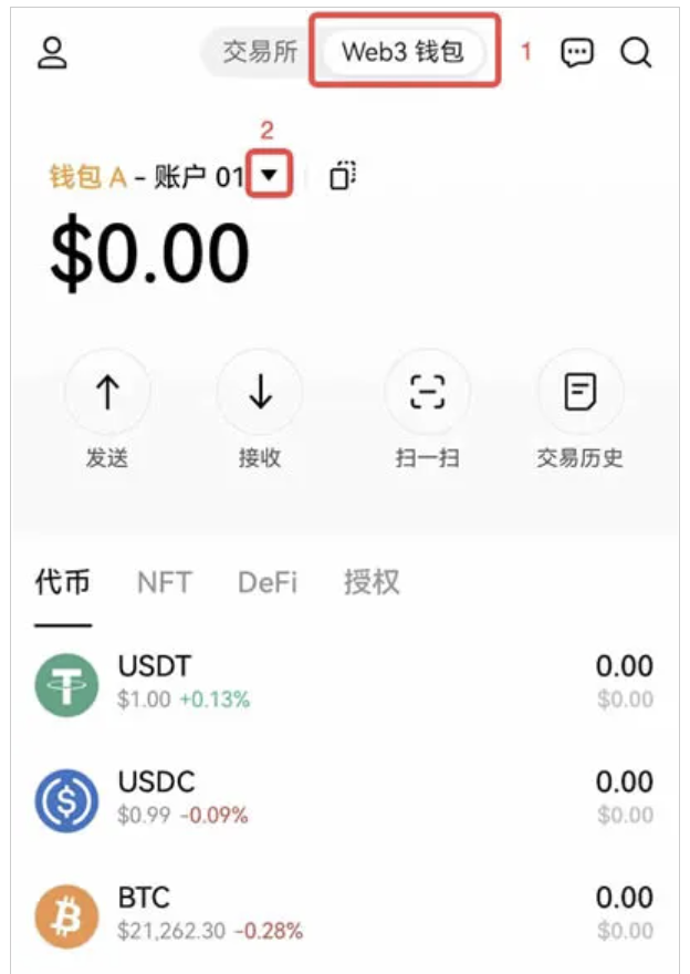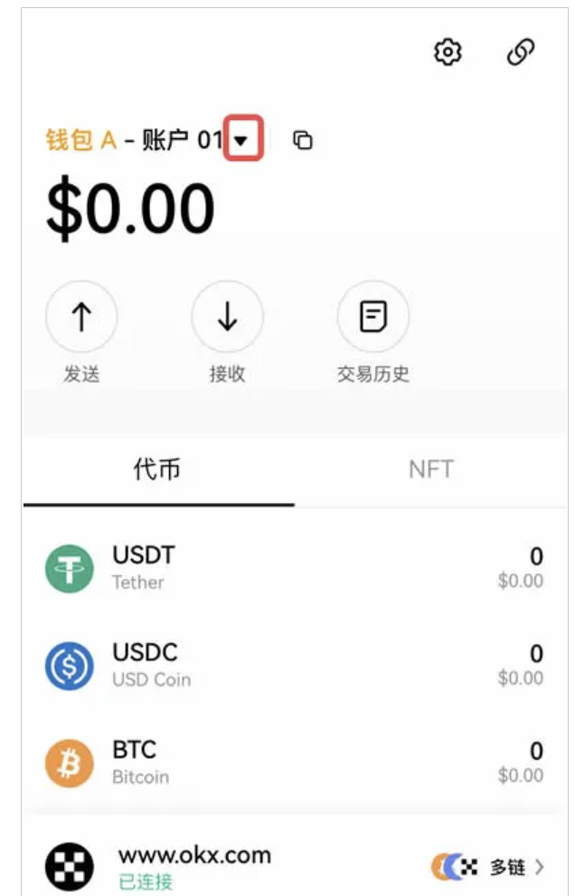 如果在歐易Web3創建/導入了多個錢包,或生成了多個賬戶,如何才能切換錢包/賬戶呢?點擊【▼】,進入【錢包管理】界面,選擇要切換的錢包或賬戶。