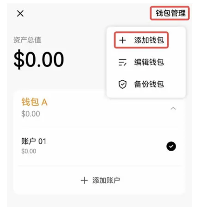 當你成功在歐易Web3創建錢包或用助記詞導入錢包,就會自動生成一個賬戶,例如錢包A-賬戶01。如果你還想創建一個新賬戶,點擊【▼】,選擇想添加賬戶的錢包,例如錢包A,然后點擊【+ 添加賬戶】,即完成新賬戶創建。錢包A下屬的這些賬戶共享一套助記詞,通常被稱為是派生錢包。