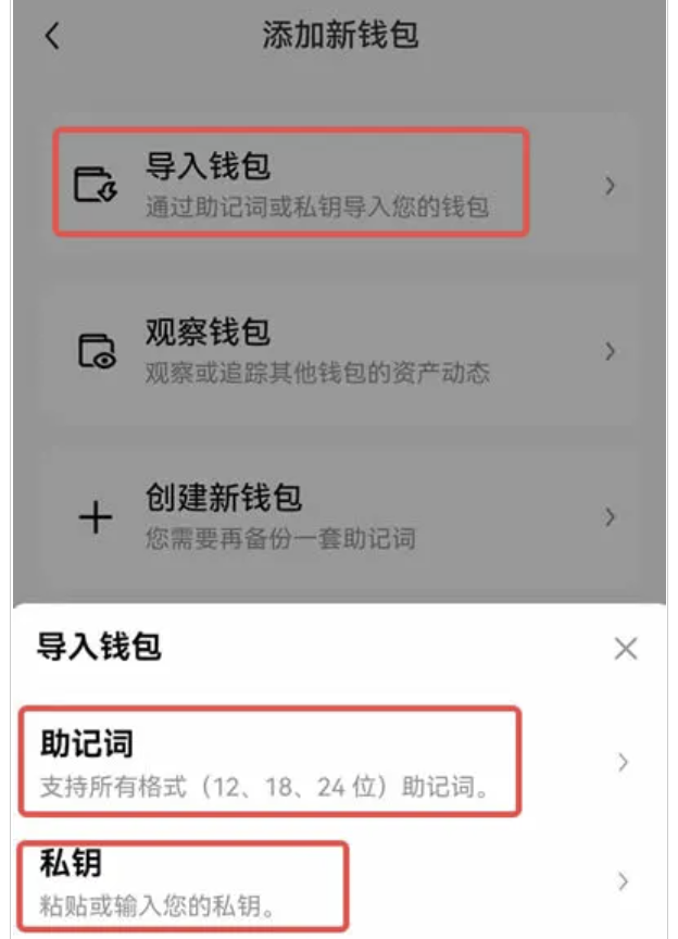 打開歐易官方App,切換至【Web3錢包】,點擊【▼】,再點擊【錢包管理】,選擇【添加錢包】。點擊【導入錢包】,根據需求,導入【助記詞】或【私鑰】并輸入,即完成錢包導入。