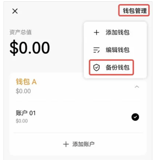 進入歐易Web3錢包界面,點擊【▼】,再點擊【錢包管理】,選擇【備份錢包】,例如【錢包A】。