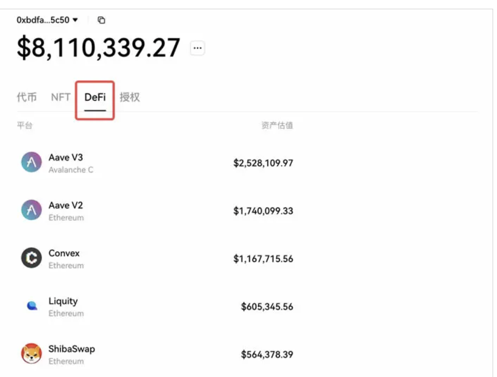 用戶可以在【DeFi】看板界面,查看某一地址參與的不同DeFi協議、質押、借幣以及收益情況。