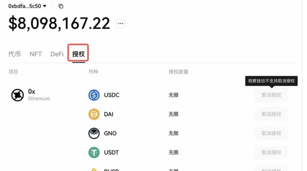 如果是連接錢包,歐易Web3【資產看板】的【授權】看板界面提供了取消授權功能,便于用戶查看已授權協議并取消。