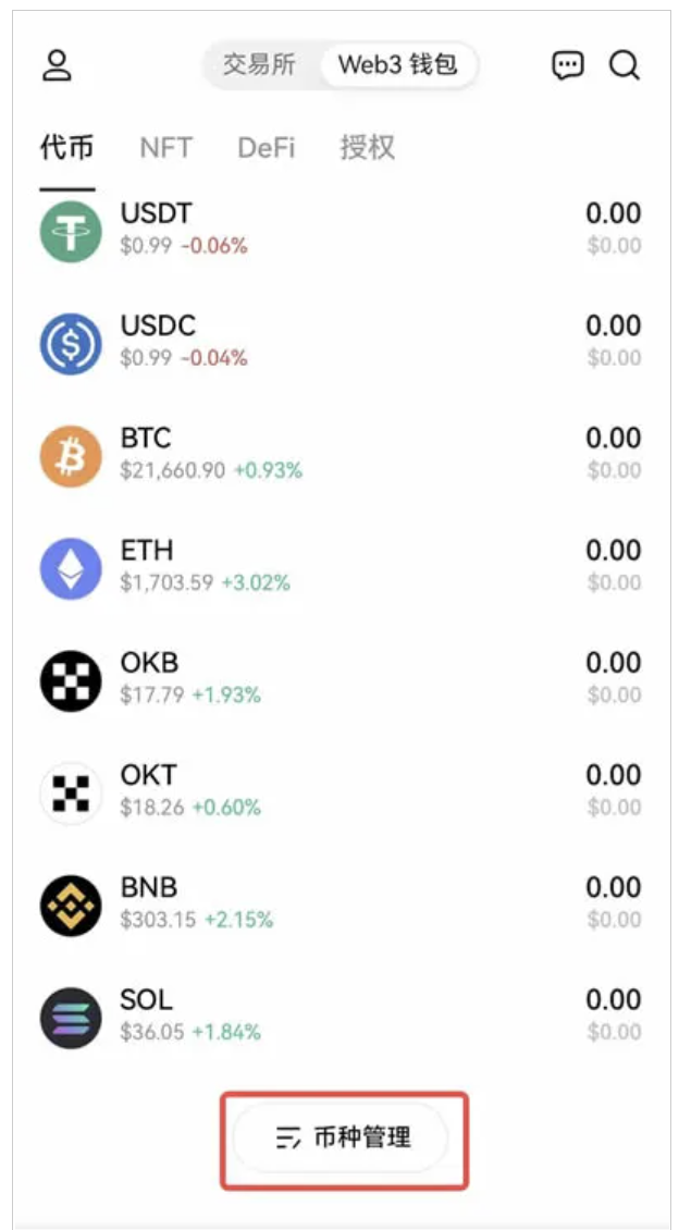 打開歐易Web3錢包,點擊【幣種管理】,在搜索框輸入幣種名稱或合約地址,如MATIC,點擊添加。