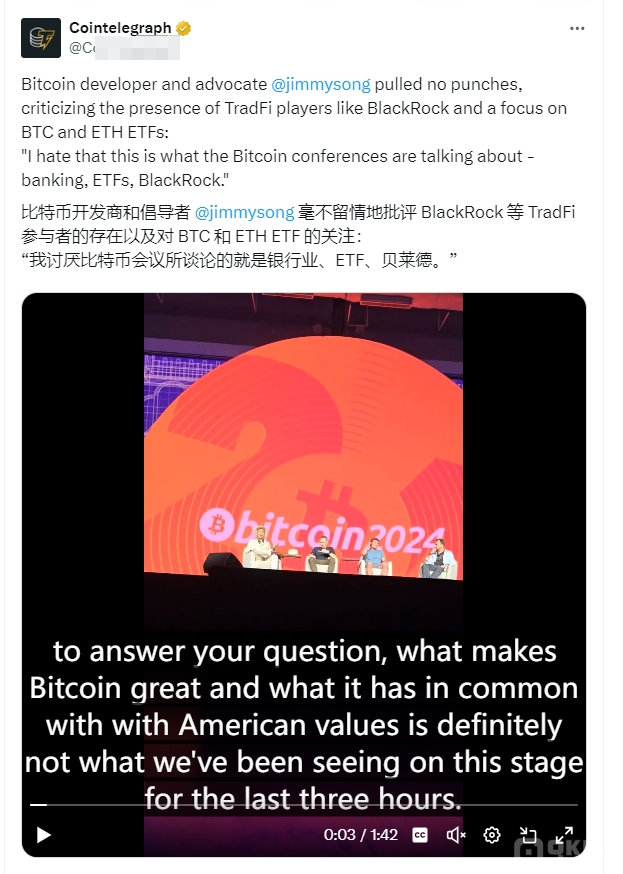 Song 還表示“我討厭這就是Bitcoin會議所討論的內容。銀行、ETF、貝萊德。這些不是我的價值觀,這些不是Bitcoin的價值觀,這些不是美國的價值觀?!?/p>