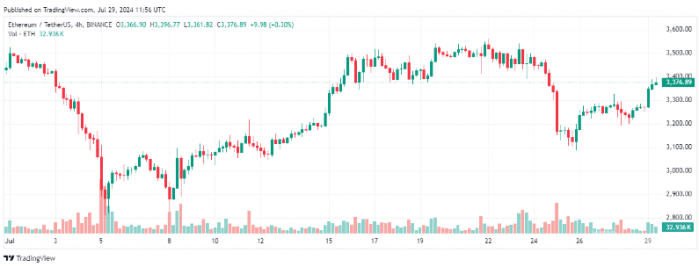 根據(jù)CoinGecko數(shù)據(jù),Ethereum現(xiàn)貨ETF推出后,ETH跌幅超過10%,觸及3100美元的低點。截至撰寫本文時,ETH的交易價格約為3376美元,在過去24小時內(nèi)上漲超過4%。