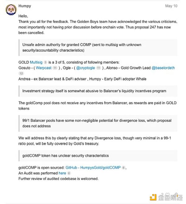 Humpy處理社區(qū)反饋如下:承認關于缺乏事先討論的批評并取消提案247;提供GOLD多重簽名的詳細信息;創(chuàng)建具有“Trust Setup”(信托設置)的新提案。