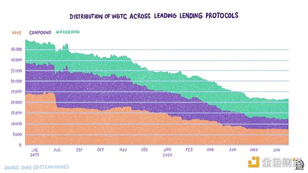 假設網絡上有N個協調Node。針對每個Bitcoin區塊隨機選擇M( Botanix的鏈兼容EVM,由PoS共識機制保護安全。除了通過參與滾動多簽網絡和促進合成BTC的鑄造和贖回來保護Bitcoin上的BTC安全之外,協調者還參與了EVM鏈的區塊構建。他們將根哈希(Botanix EVM交易的壓縮版本)作為Bitcoin的銘文發布。 讀者必須注意的是,僅僅發布Bitcoin數據并不意味著結算。不同之處在于,像Botanix這樣的外部鏈以銘文的形式發布的數據存儲在一個未經BitcoinNode(礦工)驗證的地方。Bitcoin協議完全不知道這些數據的存在。因此,無法確定銘文中所發布的交易數據是否正確。 截至2024年6月,Botanix EVM和Spiderchain處于測試網階段。 (4)Citrea Citrea正在Bitcoin上開發一個ZK rollup?!霸贐itcoin上”是什么意思?意思就是它打算使用Bitcoin作為數據可用性層。該公司表示,擴展Bitcoin區塊的最安全并且激勵一致的方式就是將執行與鏈上可驗證性和數據進行分片。分片執行意味著將執行分解成更小的部分。 然后,Citrea聚合分片或交易包,并在Bitcoin上發布兩個交易包之間的狀態差異,以及稱為有效性證明的證明。但問題是,Bitcoin目前還沒有能力驗證任何證明。Citrea的最終形式將不得不等到Bitcoin擁有允許其驗證ZK證明的操作碼。 與此同時,它將使用BitVM實現作為證明的臨時方案,并將BTC橋接出入rollup。當然,Citrea繼承了BitVM在前面內容中提到的缺點。在未來,隨著BitVM的改進,Citrea將改進其橋接功能。 截至2024年6月,Citrea還處于測試網階段。 (5)Mezo Mezo將自己標榜為Bitcoin的經濟層,不將自己稱為BitcoinL2。它使用Threshold Network的tBTC橋將BTC帶入和退出EVM鏈——Mezo。 Mezo的開發團隊曾開發過tBTC、Fold、Keep和Taho等產品。該團隊多年來一直在圍繞Bitcoin開發應用程序。Mezo的目標很簡單:擴展BTC的用例。它采用以下三種機制: · 讓Mezo用戶通過質押BTC賺取收益,以保護網絡安全。 · 讓用戶使用BTC支付gas費,并將其分配給veBTC和veMEZO質押者。 · 構建端到端的BitcoinFi體驗。 BitcoinFi和經濟層究竟意味著什么?大多數新鏈,包括EVM鏈,都依賴于現有的用戶體驗——相同的錢包、橋接方案,等等。更新用戶體驗幾乎從來都不是優先考慮的問題。Mezo從頭開始策劃整個用戶體驗,這是我很少看到的。它包括: · 由BTC支持的原生穩定幣(mUSD),因此用戶不必從其他鏈上橋接BTC。 · 一個由BTC擔保的長尾借貸協議。 · 一個完全集成的出入金通道(兼容Fold)。 · 集成錢包體驗(兼容Taho)。 結合所有這些應用程序創建一個獨特的端到端BitcoinFi體驗: Mezo基于Cosmos SDK,使用Comet BFT來達成共識。 CometBFT是用于在多臺機器上安全、一致地復制應用程序的軟件。說到“安全”,我們意指CometBFT可以在不超過1/3的機器以任何方式發生任何故障的情況下仍然工作。說到“一致”,我們意指每臺無故障機器都可看到相同的事務日志并計算相同的狀態。安全和一致的復制是分布式系統中的一個基本問題;它在從貨幣到選舉到基礎設施編排等廣泛應用程序的容錯方面發揮著關鍵作用?!獊碓矗篊ometBTF文檔 它由兩個組件組成——共識引擎和通用應用程序接口。基于Tendermint核心,共識引擎負責區塊的產生、驗證和最終確定性。Tendermint是最早的權益證明共識設計之一。它提供拜占庭容錯(BFT)共識,可以容納多達三分之一的惡意Node。 應用程序接口——應用程序Blockchain接口(ABCI)——將共識引擎與應用程序分離。ABCI的一個主要優點是,由于共識和應用程序是分離的,開發人員不需要使用構建共識引擎的同一語言來構建應用程序。 接口充當將交易傳遞給應用程序以供執行的媒介。這種功能使系統更加模塊化,并有助于聚焦更多的應用程序開發人員。最初,Mezo將只與EVM運行時兼容。 Mezo的經濟設計是這樣的:隨著它的發展日益顯著,Bitcoin持有者可能會直接或間接受益。他們可以在Mezo上持有BTC并獲得質押收益,或者,如果他們選擇繼續持有BTC,他們將通過將BTC退出流通獲得一些好處(用來支付Mezo的費用)。 Mezo擁有一個雙重質押模型,如下圖所示。網絡上的驗證者們可以質押BTC和MEZO(MEZO網絡的原生Tokens)。通過質押BTC和MEZO,驗證者分別獲得veBTC和veMezo。“ve”代表validator escrowed(驗證者托管),這些Tokens通常被鎖定在智能合約中。驗證者托管的Tokens持有者擁有治理權,網絡獎勵和費用收入是與他們共享的。 資產被鎖定的時間越長,發出的veTokens就越多。veBTC質押者獲得BTC,veMEZO質押者獲得MEZO獎勵。可燃燒部分MEZO獎勵以增加BTC資金。 Yield是Mezo的核心產品之一,因為用戶支付的費用是支付給質押BTC的驗證者的。Mezo將通過與Mezo的姊妹項目Acre提供流動質押,進一步擴大BTC質押的范圍。當用戶將BTC存入Acre時,他們會獲得一個流動質押TokensstBTC作為回報。BTC存儲可跨鏈應用,用于各DeFi應用程序。通過這些活動產生的收益以stBTC的形式積累,以1:1的比例與BTC兌換。 擁有超萬億美元市值的BTC甚至還沒有觸及到借貸市場的表面。借貸市場中的WBTC分布如下圖所示。它表明,在2023年7月至2024年6月期間,前三大借貸應用中使用的WBTC數量從約50k下降到約23k。借貸應用程序中WBTC總量的下降可歸因于WBTC供應量下降了48%,從2022年5月的28.5萬WBTC下降到如今的僅超15萬WBTC。這種下降主要是由于市場意識到了在Luna、3AC和Alameda之后中心化的各方帶來的風險。 在推出的第一階段,Mezo已經開始接受三個鎖定期的BTC存款,分別為:兩個月