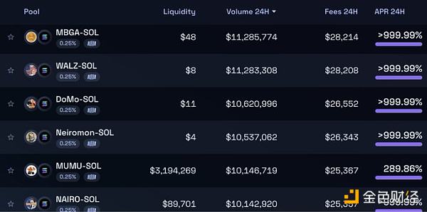 每一個低流動性池都是在過去 24 小時內(nèi)跑路的項目。以 MBGA 為例,在過去 24 小時內(nèi),Raydium 上發(fā)生了 46,000 筆交易,交易量達 1,080 萬美元,2,845 個獨立錢包進行買賣,并產(chǎn)生了超過 28,000 美元的費用。(請注意,類似規(guī)模得到廣泛認可的LP,MEW,僅生成了 11.2K 筆交易)