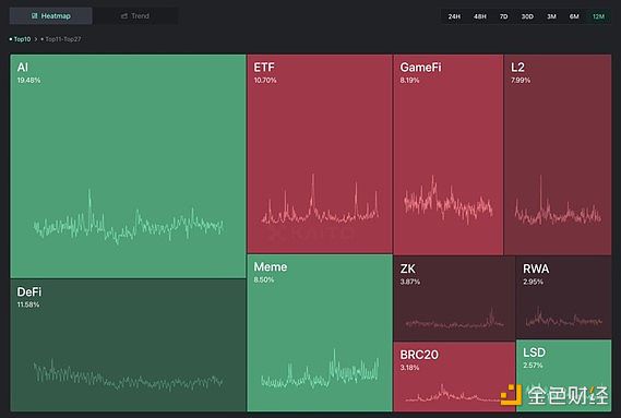在過去的兩年里,人工智能顯然已經(jīng)成為科技界的焦點,吸引了企業(yè)家、投資者和用戶的關(guān)注。當(dāng)然,這種熱情也蔓延到了加密領(lǐng)域。根據(jù)Kaito Ai的數(shù)據(jù),在過去的12個月里,AI在所有加密領(lǐng)域里占據(jù)了最大的敘事份額。