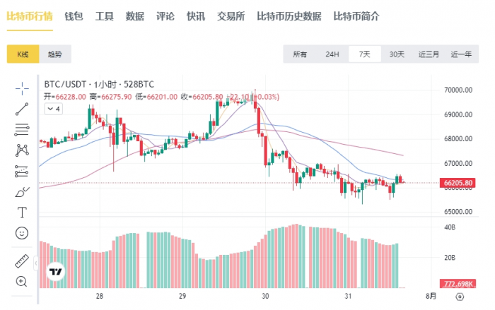 7月31日,據Blockchain網行情數據,Bitcoin多頭試圖守住66,500美元的支撐位,但在凌晨失敗,導致午盤后跌至65,526美元的低點,空頭尋求測試65,000美元支撐位的強度。截至發稿時,Bitcoin價格回升至66,205美元,24小時跌幅0.95%。
