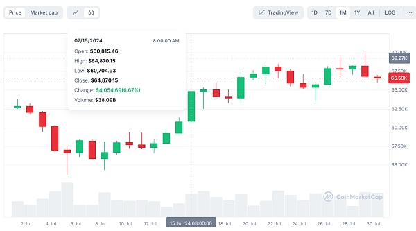 1.7月15日-7月28日,BTC強(qiáng)勢反彈,最高上漲至6.9萬美元(7月27日),收漲12.56%。ETH最高上漲至3543美元(7月22日),7月23日Ethereum現(xiàn)貨ETF正式獲批上市交易后,ETH經(jīng)歷短暫上漲,然后開始下跌,收于3269美元,收漲2.44%。預(yù)期灰度EthereumETF流出壓力相比當(dāng)時BitcoinETF要小,而整體EthereumETF的規(guī)模和增長速度將不及Bitcoin現(xiàn)貨ETF,以至于Ethereum漲幅也會小于當(dāng)時BTC的表現(xiàn)。BTC現(xiàn)貨ETF上市后,BTC價格2個月后突破歷史新高,漲幅達(dá)到62%。